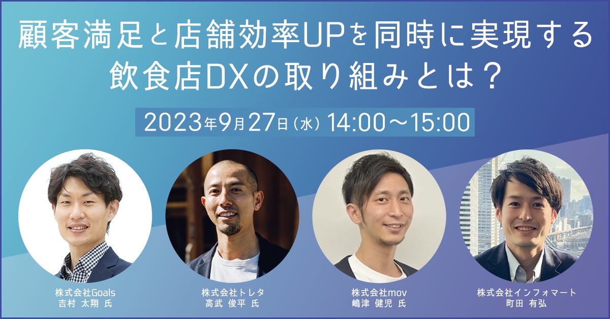 今回、インフォマート、トレタ、mov、Goalsの4社で、顧客満足とリピート率の向上や、純粋な店舗の営業活動以外で発生するバックオフィス業務の効率化を同時に実現するマーケットリーダーの飲食店DXの取り組み事例をご紹介するパネルディスカッション形式のセミナーを開催します。