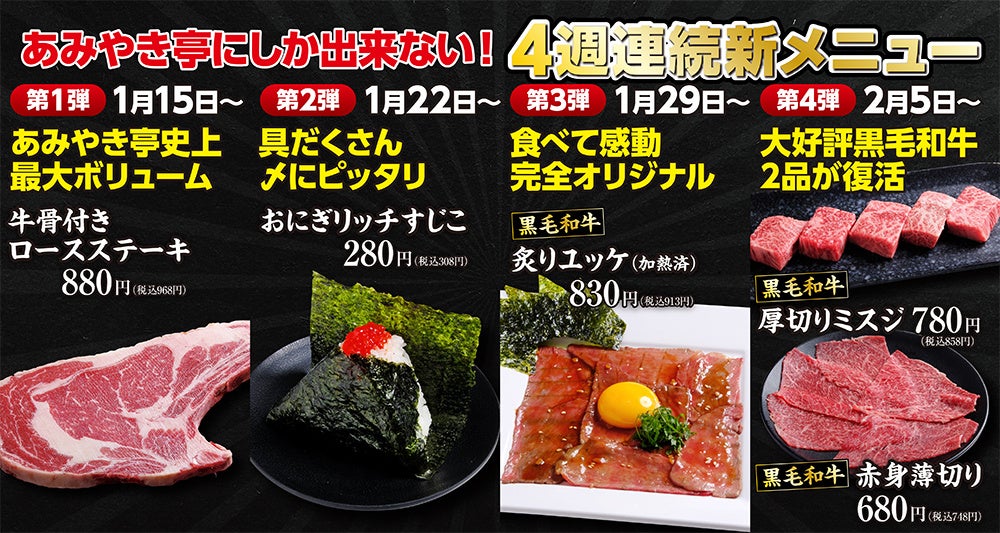 【あみやき亭(中部)】怒涛の4週連続新メニュー登場!!