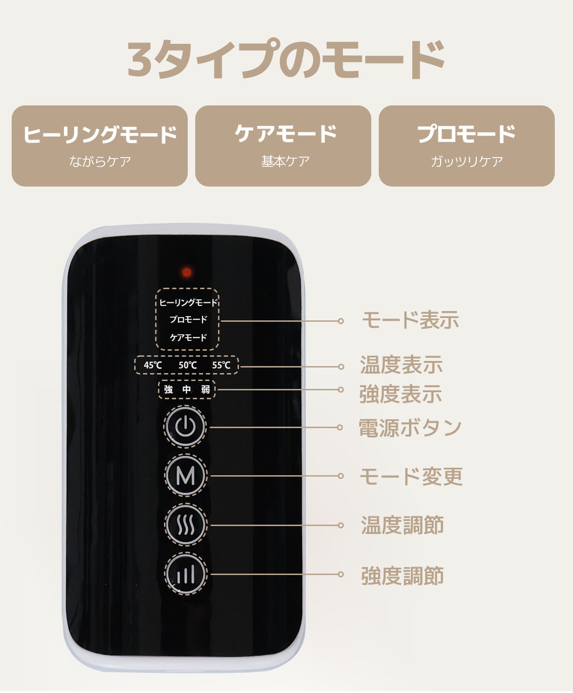 合計3タイプのマッサージモード、3段階の強度が選べるので、普段のデスクワーク、長時間の運転による疲労、育児、家事に追われる方、または頻繁に運動をされる方もケアできます。