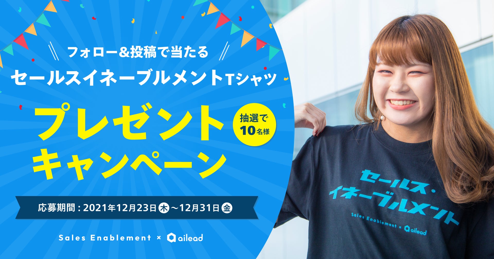 本キャンペーンは、ailead公式Twitterアカウント(@ailead_app)をフォローし、ハッシュタグ「#セールスイネーブルメント」をつけて投稿することで、抽選で10名の方にセールス・イネーブルメントTシャツが当たります。
