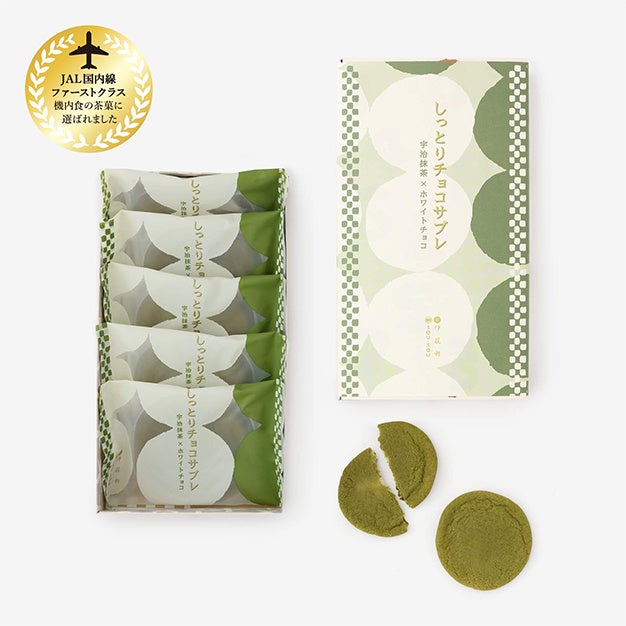 JAL の「地域プロモーション活動」 2月の京都特集の一つとして、昼食時間帯の羽田着便・伊丹発那覇着便の機内食の茶菓に選ばれました。宇治抹茶を練り込んだしっとりやわらかな生サブレで、とろけるホワイトチョコガナッシュを包んだ焼き菓子です。
