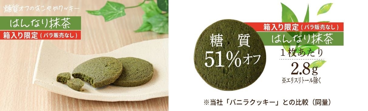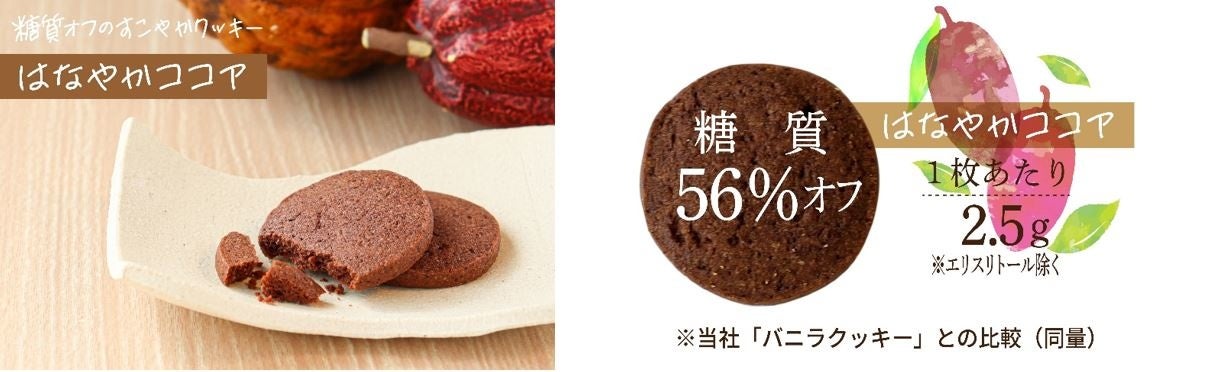 また、食物繊維を加えることで満足感を与え、「さわやかレモン」にはクリームチーズを、「はんなり抹茶」には京都府産の抹茶を、「はなやかココア」には有機栽培のカカオを加えることで、糖質オフでも風味豊かな味わいのクッキーに仕上がりました。