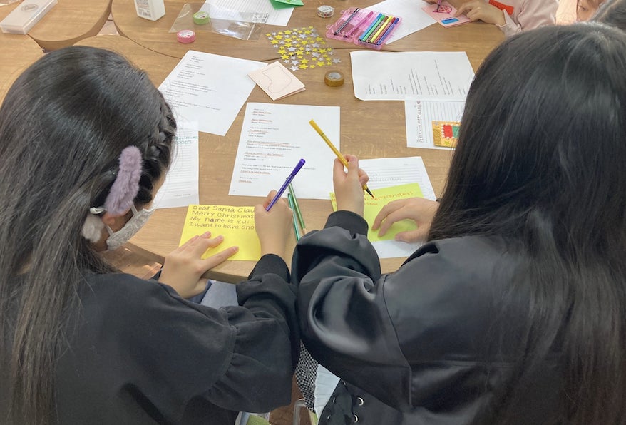 クリスマスについて学んだ後は、みんなでクリスマスカードを作りました!サンタさんにカードを書く子もいれば、友達や親に書く子もいました。みんな思い思いに英語で欲しいものや日頃の感謝を書き起こし、世界に一つだけの特別なクリスマスカードが完成しました。