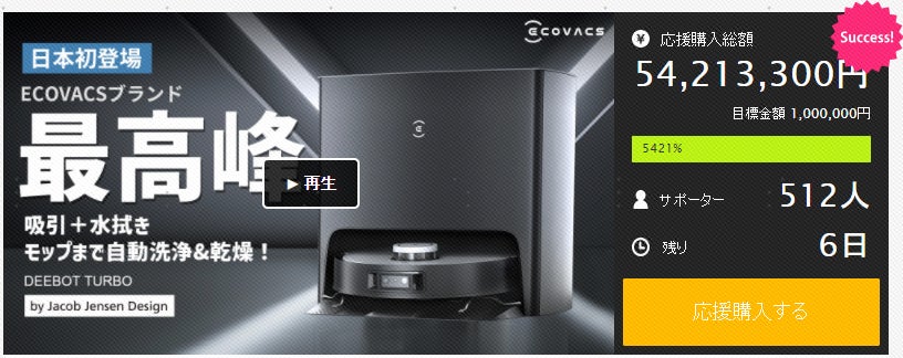 ロボットの研究開発、生産、販売を一体化した家庭用ロボットの総合メーカー・エコバックスジャパン株式会社(本社:東京都新宿区、代表取締役社長:坂梨文康)のMakuakeプロジェクトは、サポーター数510名を超え、応援購入総額は5,400万円を突破しました。