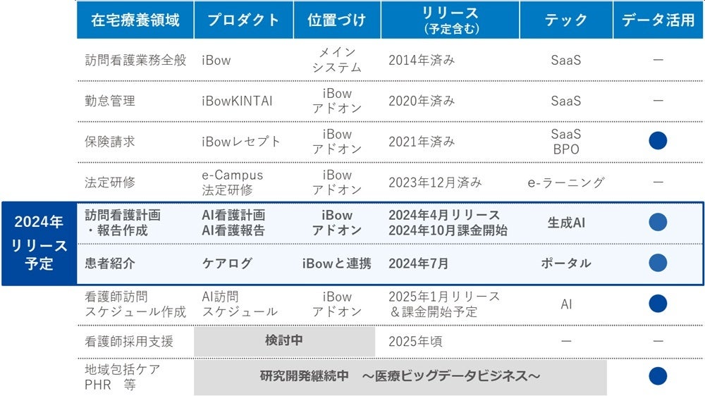 事業内容:在宅医療分野における業務支援事業(訪問看護ステーション向けSaaS型業務支援ツール(電子カルテシステム「iBow」)等を提供する事業、診療報酬請求業務を代行する「iBow 事務管理代行サービス」など)