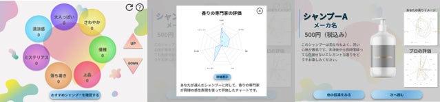 今回の実証実験では、対象となる全17種類のシャンプーそれぞれに対して、調香師として30年以上のキャリアを持つ香りの専門家が行った評価をAIに学習させました。お客さまには香りを表現する上で馴染みのある7つの感性キーワードの期待値を自由に調整していただき、ご自分のお好みのプロファイルを作成していただくことで、お客様の香り感性プロファイルをAIが自動解析し、プロの評価に基づいたおススメのシャンプーを3種類提案いたします。