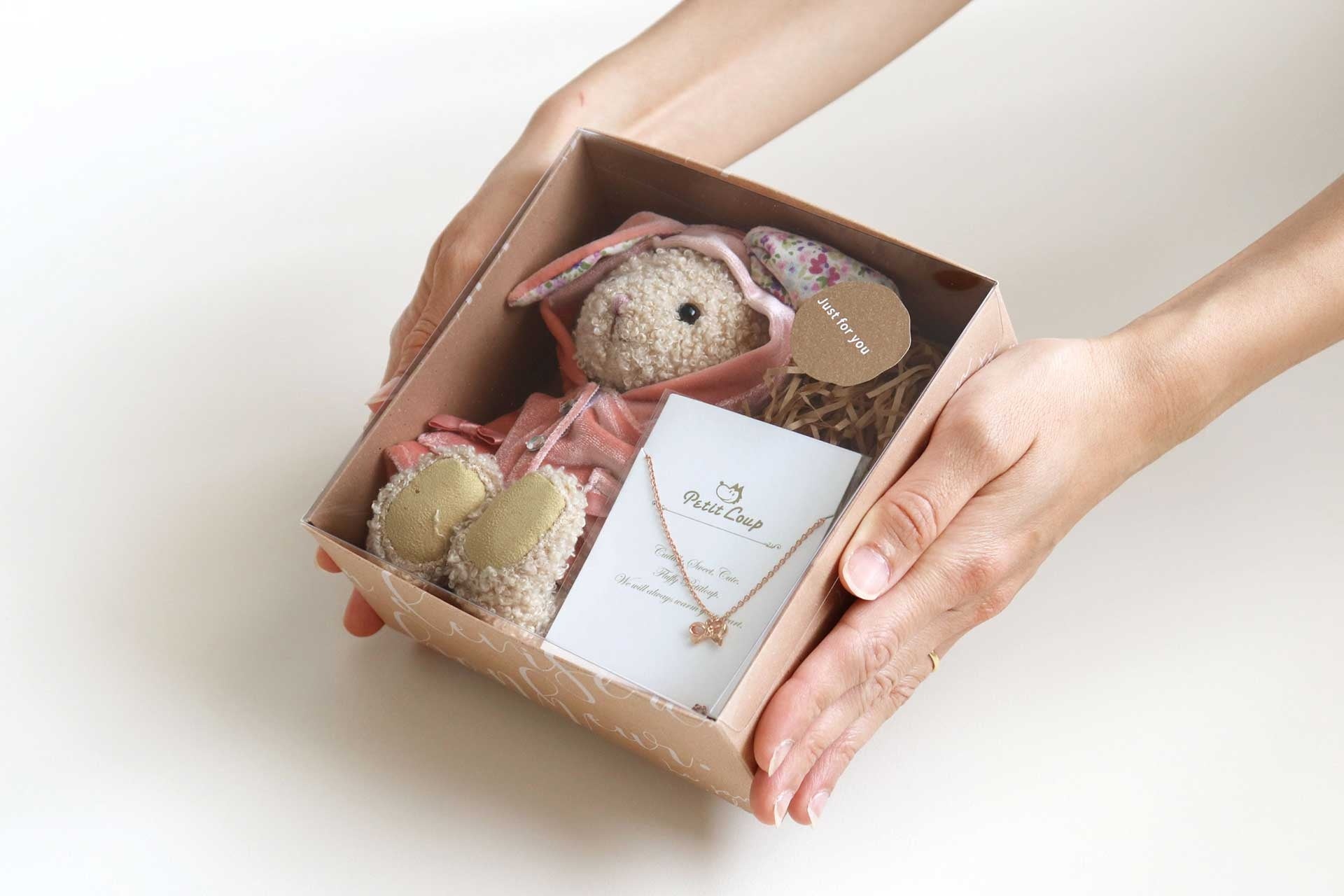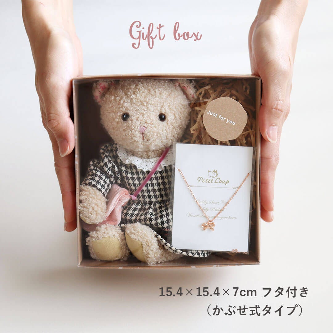 プレゼントに最適なナチュラルなギフトBOX。テディベアとネックレスの姿が見えるのがおしゃれ。心のこもったプレゼントにぴったりです。