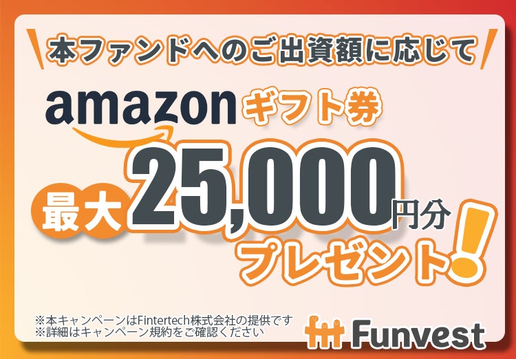また、本ファンドに投資していただいた投資家の皆様を対象として、出資額に応じて最大25,000円分のAmazonギフト券を進呈するキャンペーン」も併せて実施いたします。