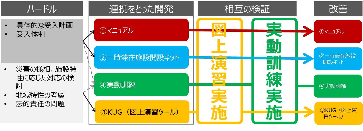 民間事業者による一時滞在施設設置にあたっては、具体的な受入計画や組織体制の整備、災害の様相や施設特性に応じた対応、地域特性の考慮の必要性、法的責任の問題等、実務上のハードルが高いことが課題となっています。このような課題を踏まえ、本協議会では、①汎用的な一時滞在施設運営マニュアル、②マニュアルを可視化した一時滞在施設開設キット、③実務上の課題を検討する図上演習ツール、④実動訓練という4つの要素を総合的なプログラムとして相互に連携させることで、より高い効果を発揮させる取り組みを実践しています※。