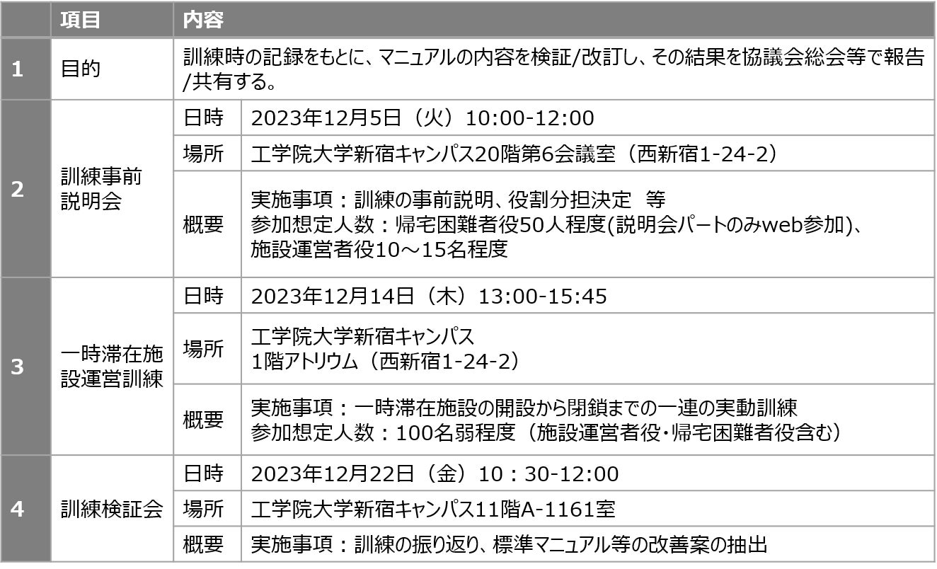 今回の訓練では、「一時滞在施設運営マニュアル(感染症対策版)」の実効性の検証を目的として、協議会メンバーで連携した一時滞在施設運営訓練※5を、昨年度よりもより厳しい状況を設定し対応を検証します。