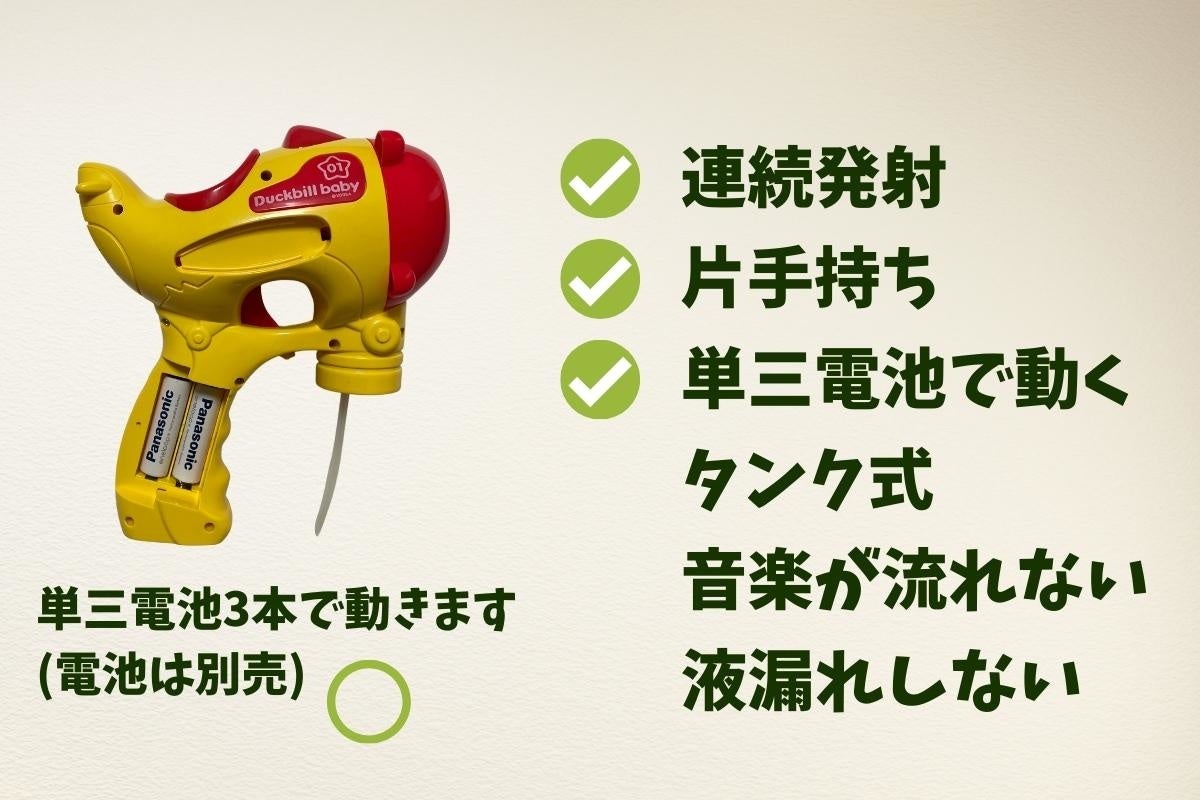 バブルガンを買う機会はあまりないかと思いますので、購入時にこのような想定をして商品ページをチェックしていないためついつい、知らずに買って後悔というケースが多いです。