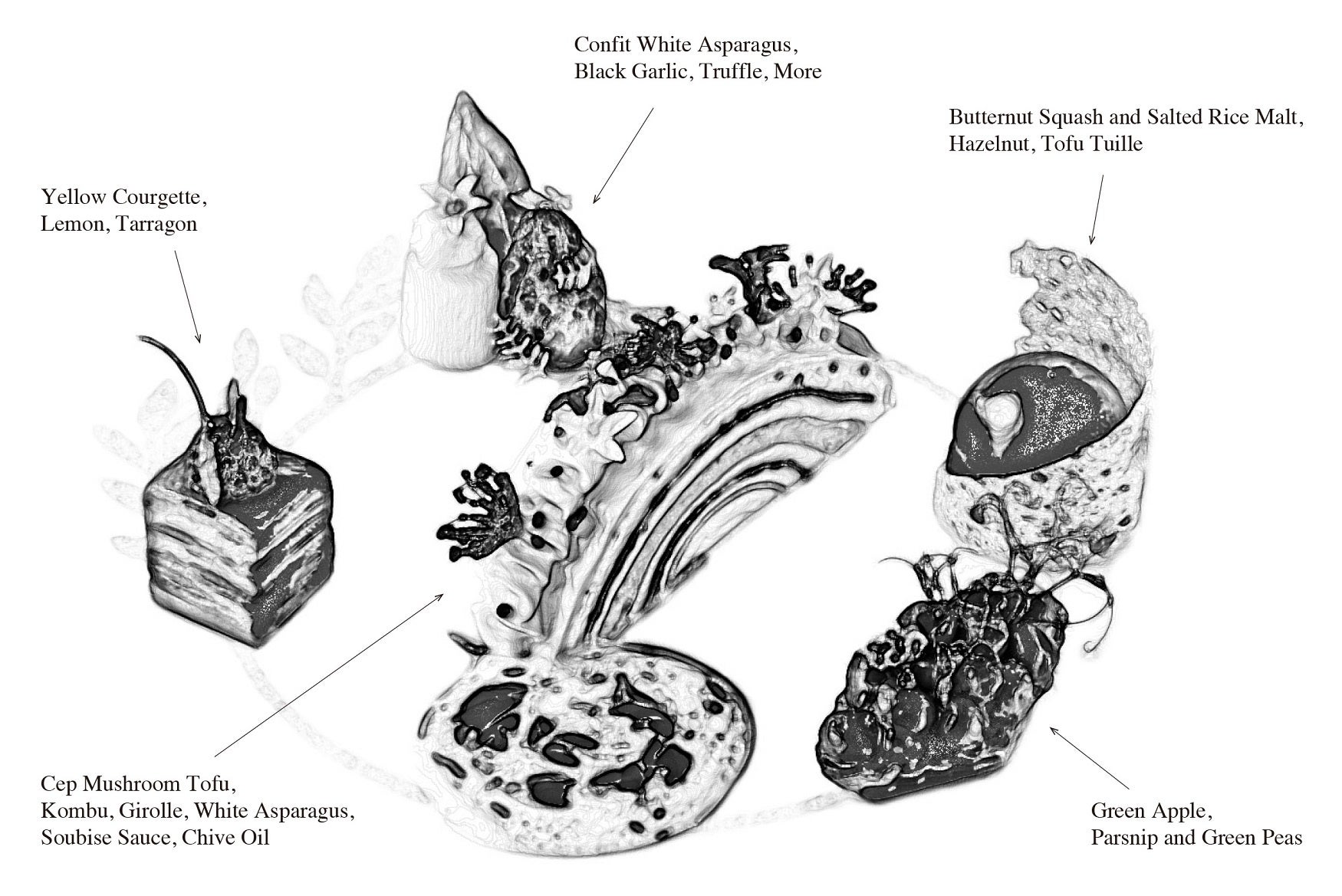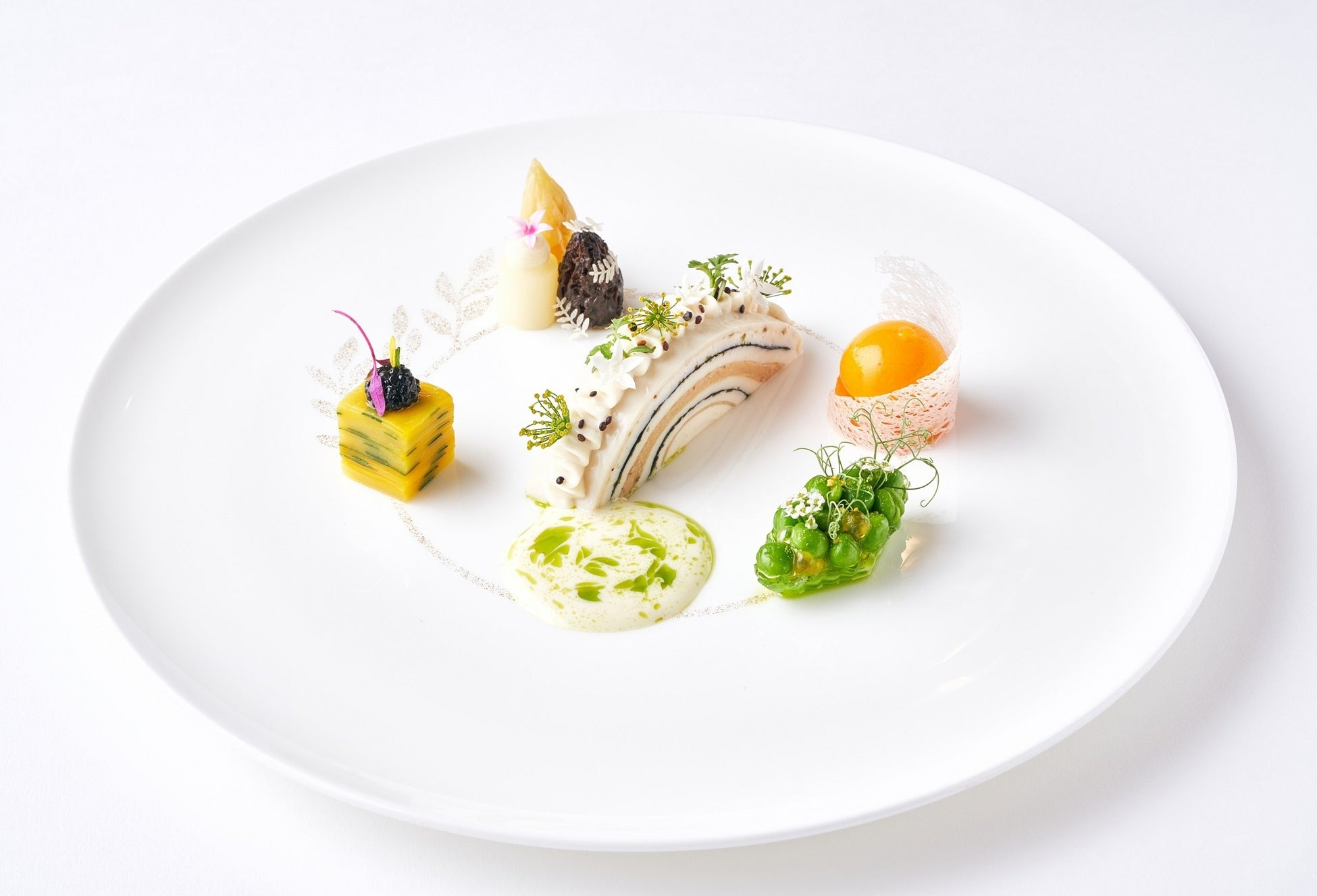 セップ茸の豆腐、昆布、ジロール、白アスパラガス、ソーススービーズ、シブレットオイル