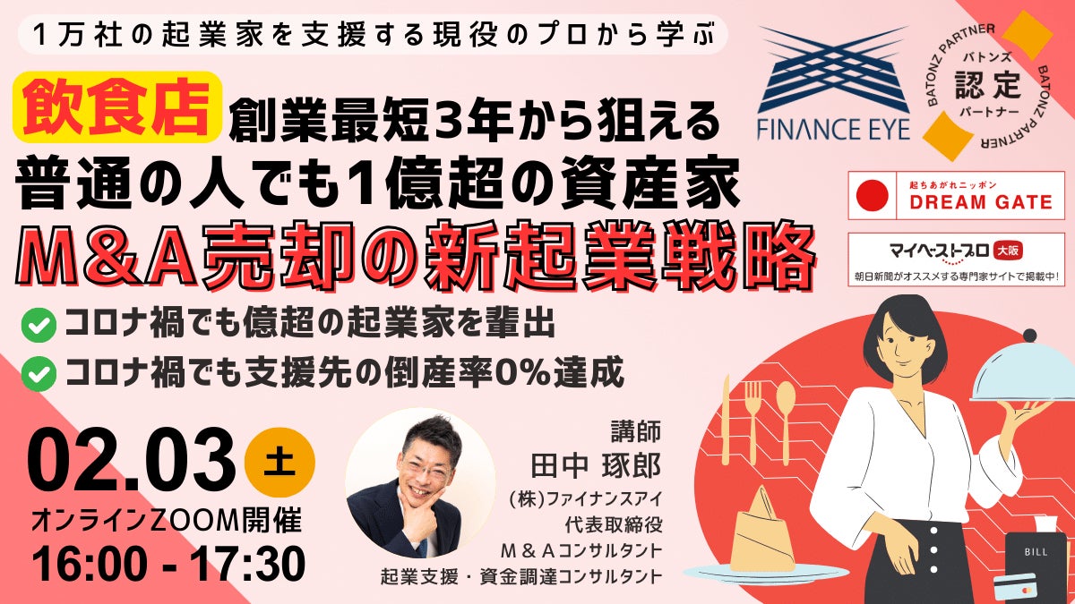 株式会社ファイナンスアイ(本店:大阪府大阪市、代表取締役:田中 琢郎。以下、ファイナンスアイ)は、M&A売却で1億超の資産家になる事を目指して「飲食店ビジネス」で独立・開業を目指すスタートアップや起業家に向けた創業セミナー【最短創業3年から狙える!1億超の資産家になるためのM&A売却の新起業戦略】を開催します。このセミナーでは、飲食店ビジネスで創業して最短3年からM&A売却のイグジットにより1億超の資産家になるための起業スキームを伝えます。事業そのものを一つの商品として売却するために、起業家は創業時からどのような事業計画を立案して、どのようなファイナンスをかけて、事業評価をバリューアップさせてイグジットを実現すればよいのか。無計画でも思い付きやアイデアで実現できる天才もいるかもしれませんが、普通の人でも再現できる戦略とスキームがあります。1万社の起業家や経営者を支援し、コロナ禍でも飲食店を含めて億超の起業家を輩出し続けたファイナンスアイがリアルに再現してきた内容を伝えます。開催日時は2024年2月3日(土)16:00にウェビナー形式で開催します。2024年の成功に向けて躍進するきっかけにしてもらえればと思います。