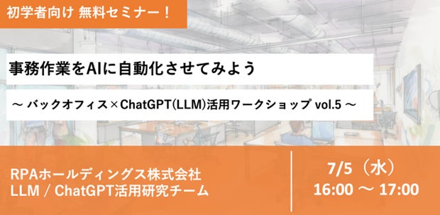RPAホールディングス(本社:東京都港区、代表取締役:高橋 知道、以下「RPAホールディングス」)は、無料のオンラインセミナー「シフト作成・採用業務の事務作業をAIに自動化させてみよう〜バックオフィス×ChatGPTワークショップ vol.5」を開催致します。