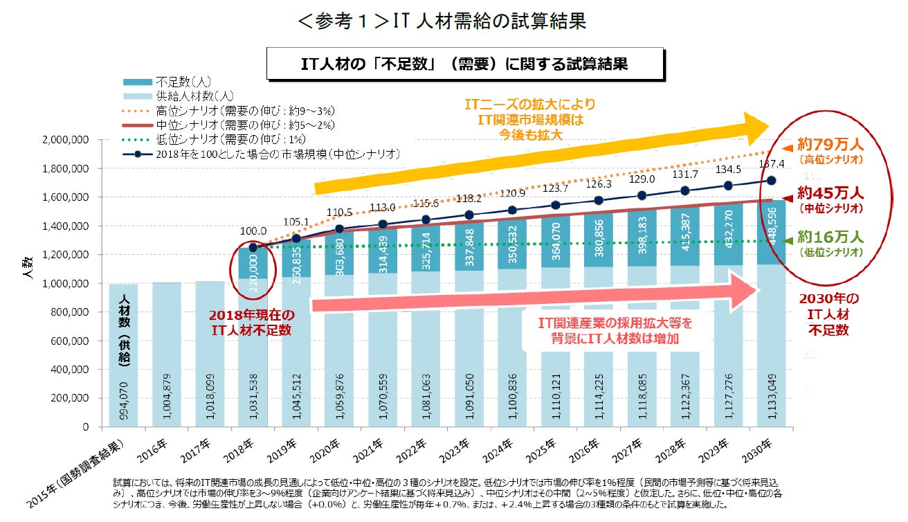 今後、IT産業の成長について、IT人材不足の解消、さらには、産業構造変化に対応した高度技術を有する先端IT人材・AI人材の拡大が求められます。