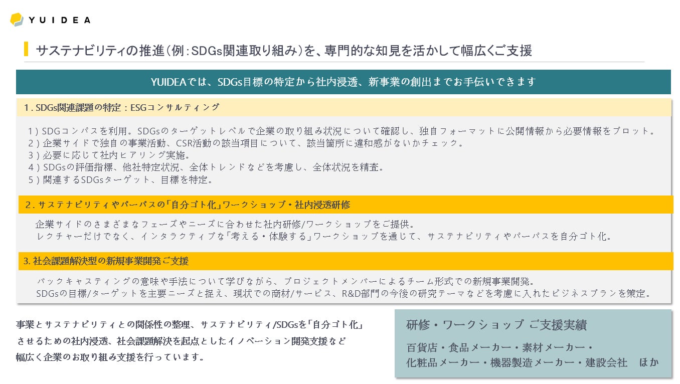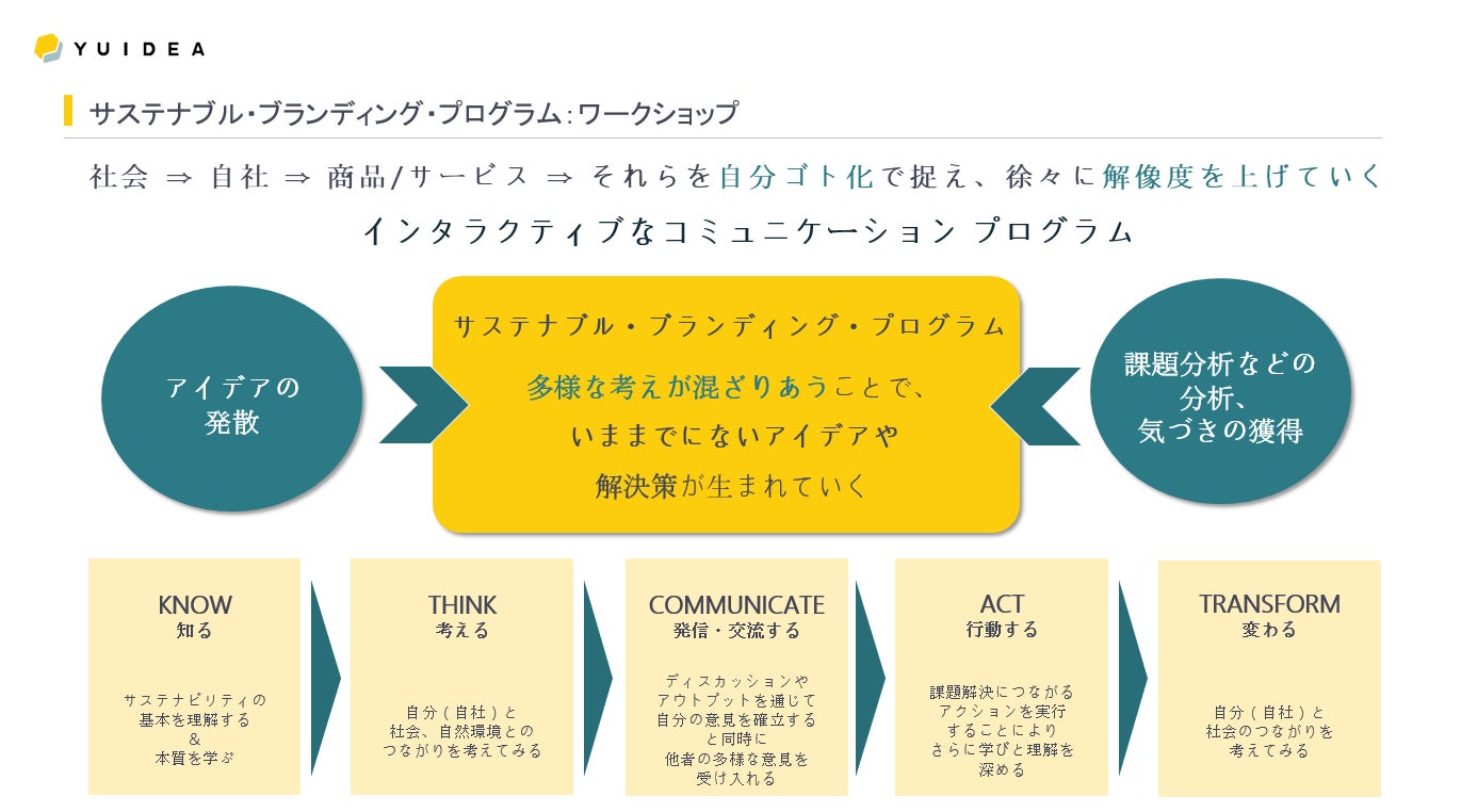 そうしたニーズに対する支援としてYUIDEAは、サステナビリティやパーパスの「自分ゴト化」を目的としたワークショップ、インタラクティブなコミュニケーションにフォーカスした研修プログラムの企画・運営や 社会課題解決型の新規事業開発の伴走を行っています。