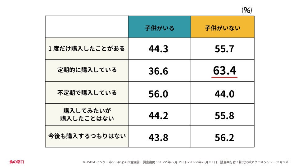 子供がいない人は魚の食品通販を定期的に購入している割合が一番多くなっていました。