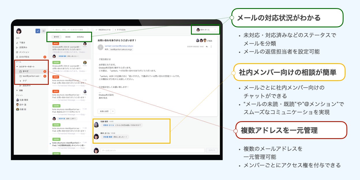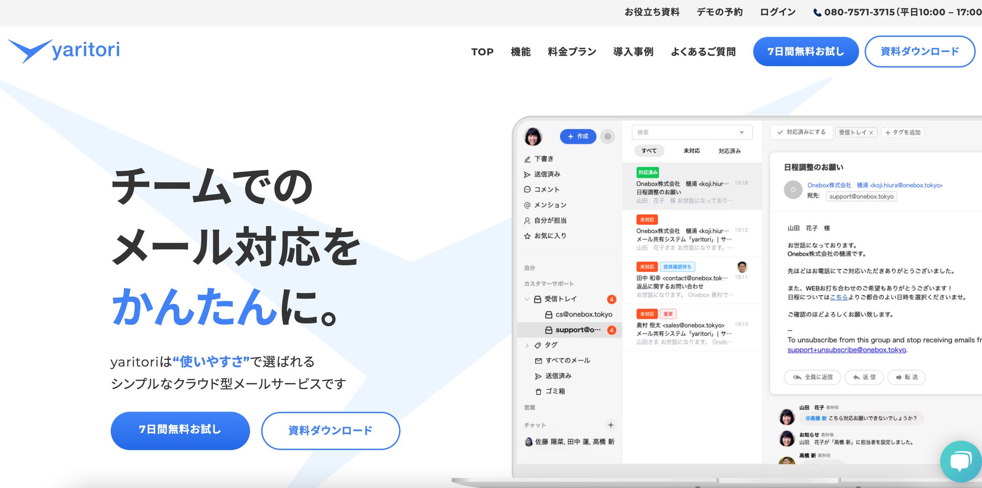 yaritoriは、複数人でのメール対応・管理を効率化するクラウド型のメール共有システムです。営業やカスタマーサポートなどお客さま対応をしている部署を中心にさまざまな業界で利用されています。