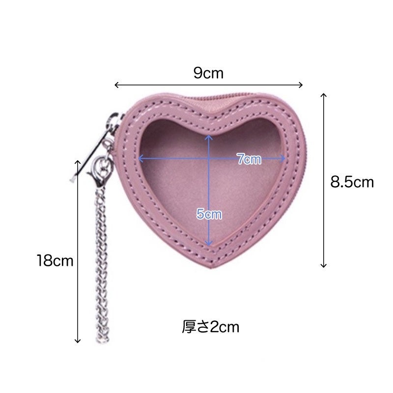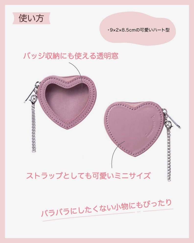 クリア窓で中身が見えるハート型のミニポーチです。チェーン付きでバッグに取り付けられます。チャームとしても可愛いころんとしたハートは、缶バッジなどの小さなグッズや普段使いのイヤホンなどにぴったりです。