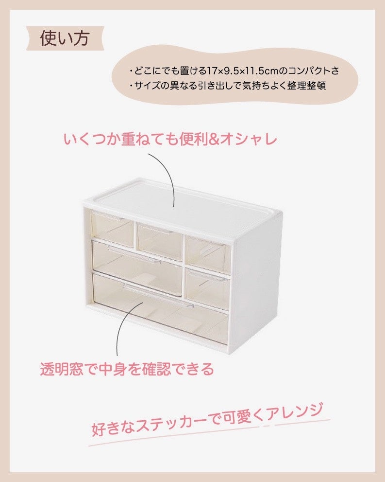 大きさの異なる4つの引き出しが付いた小さな収納ボックスです。細かなものから少し大きなものまで特徴に合わせて整理できます。シンプルな見た目はステッカーなどでアレンジも可能で、同色を重ねたり色違いで組み合わせたりしても可愛いデザインです。