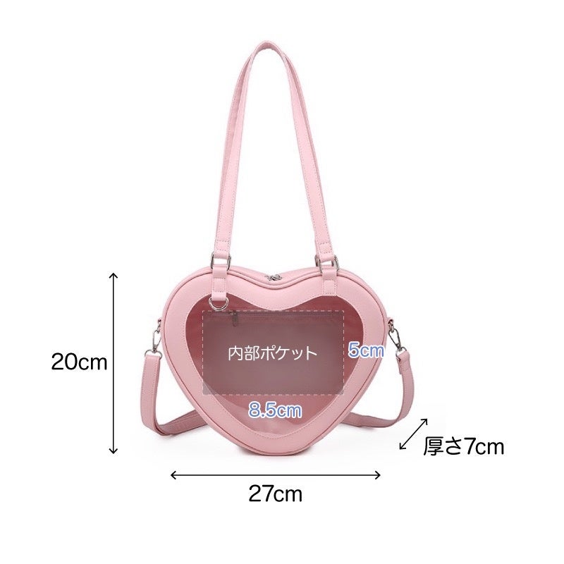 2way仕様のストラップが付いたハート型のバッグです。正面にはクリア窓付きで、バッジやぬいぐるみなどのグッズを飾れます。
