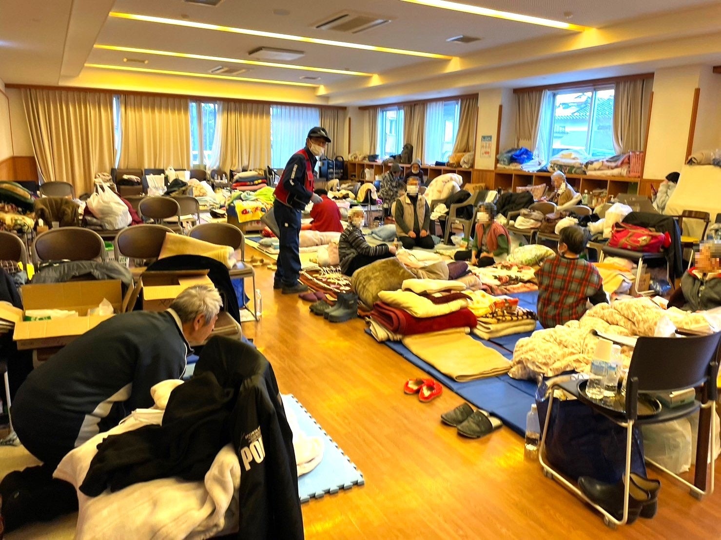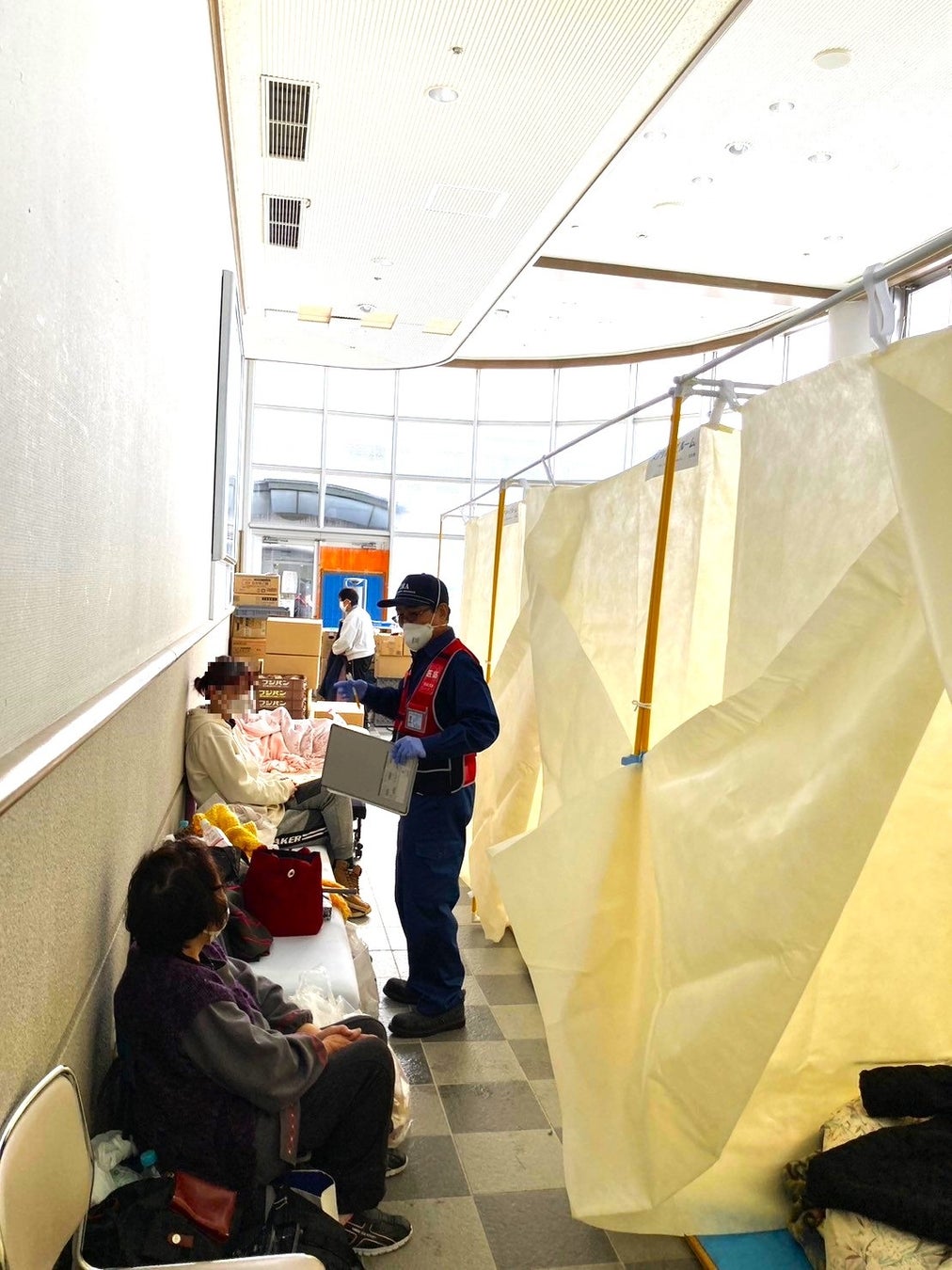 1月8日の午後からは、のとふれあい文化センターに向かいました。当日は130名の避難者のうち、8名がインフルエンザ等に感染しているということで、感染症患者を受け入れる施設としての評価、ゾーニング、指導が主なミッションとなりました。