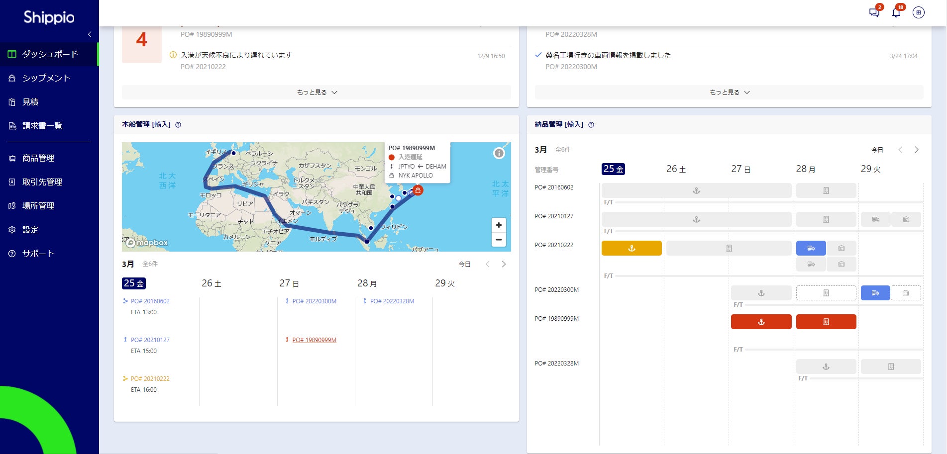 「Shippio」は、日本初のデジタルフォワーディングサービス(※1)です。貿易システムの提供と、国際物流フォワーディング業務の提供を通じて、アナログな業務が多く残る、国際物流領域のDXを推進いたします。貿易システム上では、本船動静の自動更新や見積もり・発注、貿易書類や請求書の一元管理が可能となり、デジタルを活用したビジネスプロセスの構築とオペレーションの提供を通じて、顧客企業の国際物流DXを実現します。