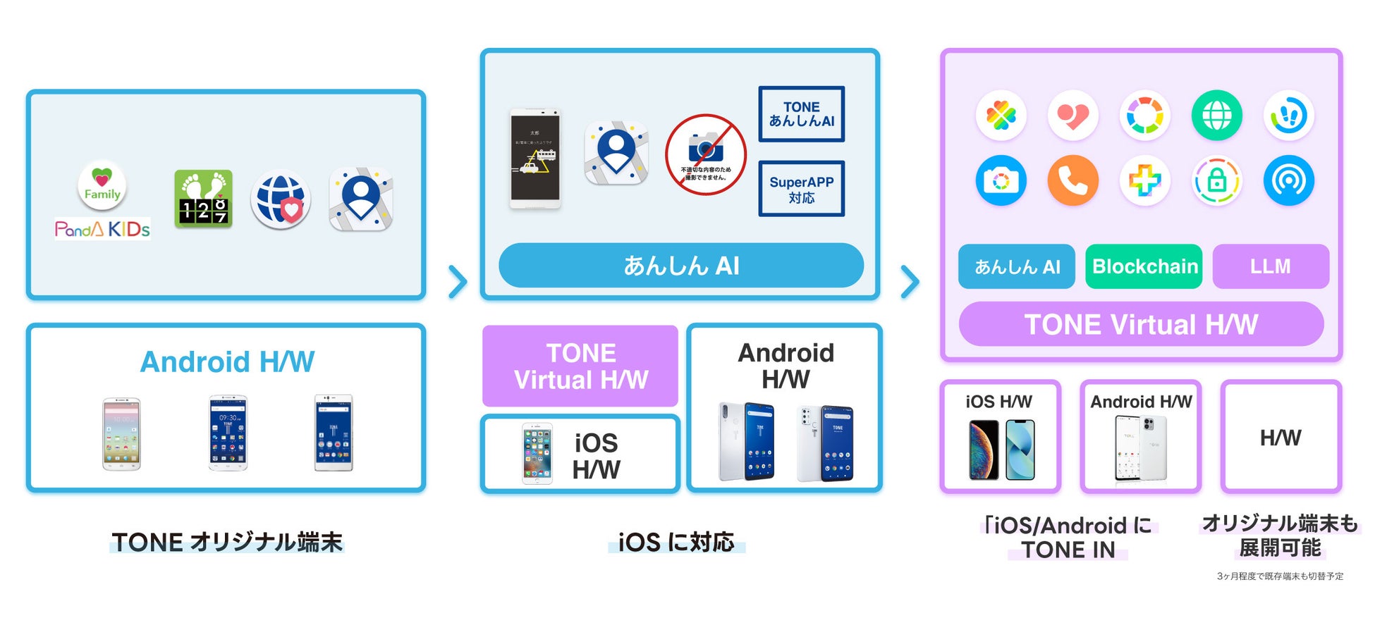 トーンモバイルでは、2013年の発売当初から、ソフトウェアコンポーネント「TONE Ware」をアップデートすることで、ユーザーニーズに合わせた安心・安全な独自サービスの提供や、各社へのカスタマイズスマホの拡販などを行ってまいりました。この度、「TONE Ware」に、「TONE Virtual H/W」コンポーネントを追加することで、対象ハードウェアの拡張が可能になったため、iOS、Androidの両OSに対し、専用SIMを挿す=“TONE IN”すると、機種に依存することなく、トーンモバイルならではのシンプルな料金プランや、家族向け見守りサービス「TONEファミリー」などのコアサービスの動作ができるようになります。対象端末として、2021年発売以降最新のモデルまでのAndroid/iPhoneの全機種にて検証が完了しており、ティーン、現役世代、シニア世代などの幅広い世代において、お好きな端末をお選びいただきながら、ライフスタイルにあったトーンモバイルのサービスをご利用いただけるようになることで、メインターゲットが大きく広がり、さらに多くの方に安心、安全のオリジナルサービスをお届けすることができるようになります。