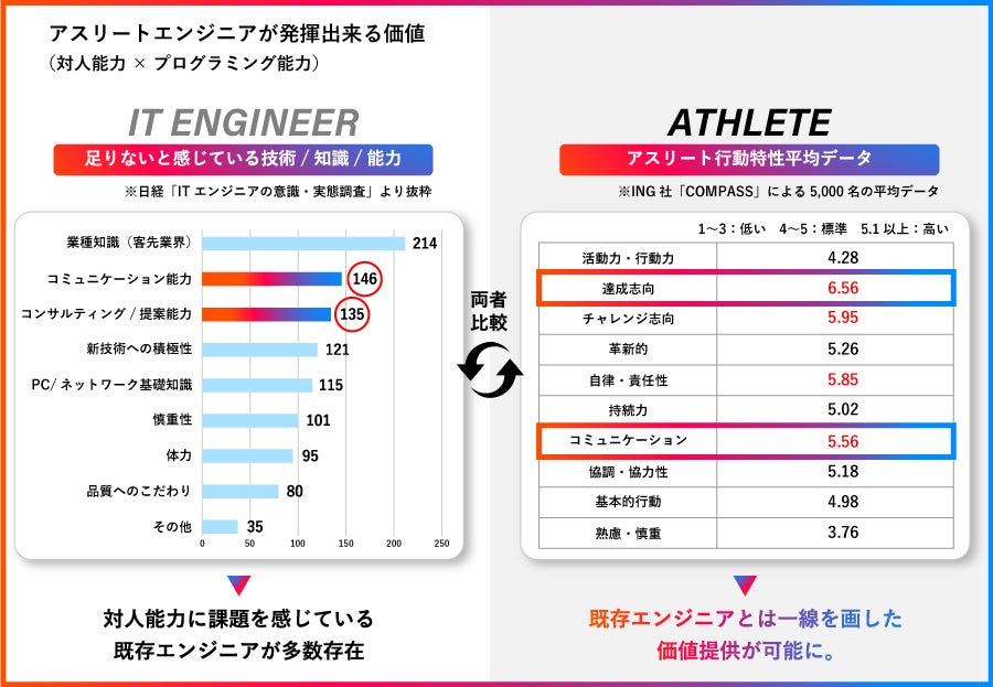 コミュニケーション能力や調整、提案能力に課題を感じているITエンジニアの方は少なくありません。(※添付アンケート調査より)エンジニアは個人作業に思われがちですが、プロジェクト単位でチームが組まれ、個人の技術力だけでなく、対人能力も作業効率、完成度に影響します。その点、アスリート人材は、競技を通じて、対人能力やPDCA習慣、人間関係構築力を学び、カテゴリは違えど、ビジネスにも活かす事が可能であり、今までのITエンジニアと違ったアプローチで業界貢献する事が可能となります。