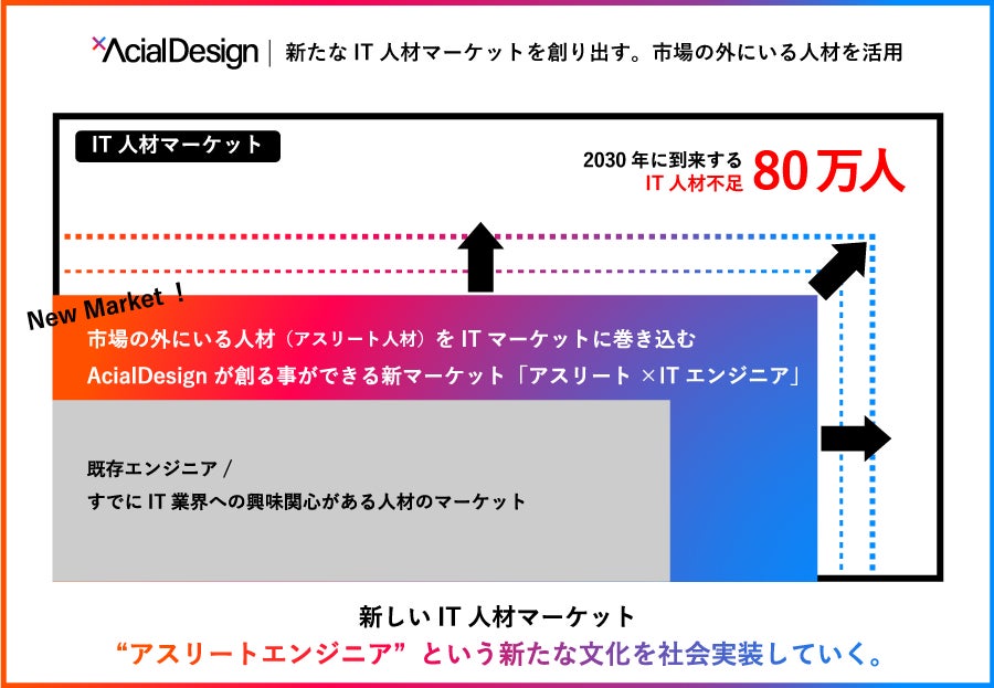 日本の重要社会課題の一つが「IT人材不足」であり、その数は「2030年に約80万人に到達する」試算が経済産業省より公開されている事は万人の知るところです。この社会課題に対して、当社は「市場の外にいる人材(アスリート人材)」をITマーケットに巻き込んでいく事によって、新たなエンジニア人材マーケットを創り出し、「アスリートエンジニア」という新たな文化を社会に実装していきます。