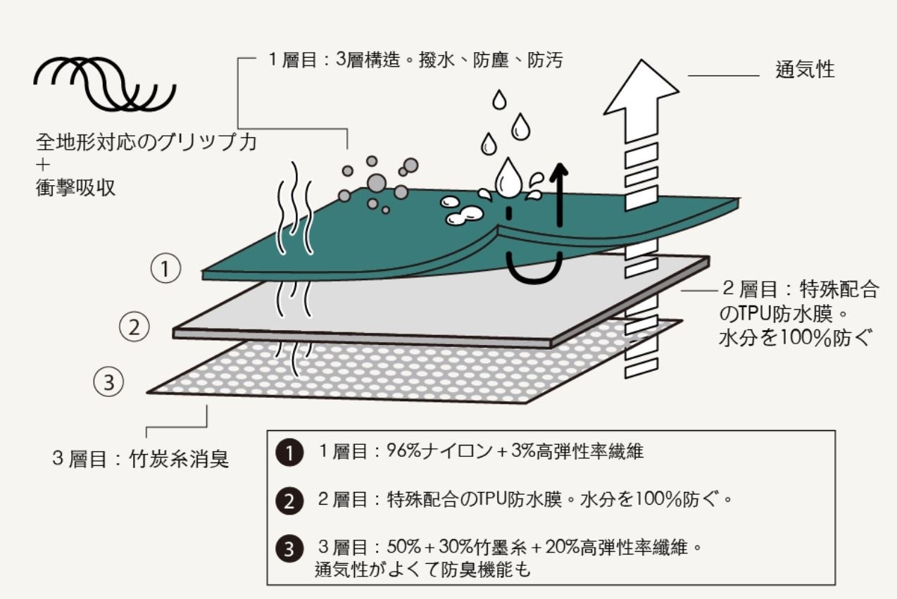 - 2層目:特殊配合のTPU防水膜。水分を100%防ぐ。
