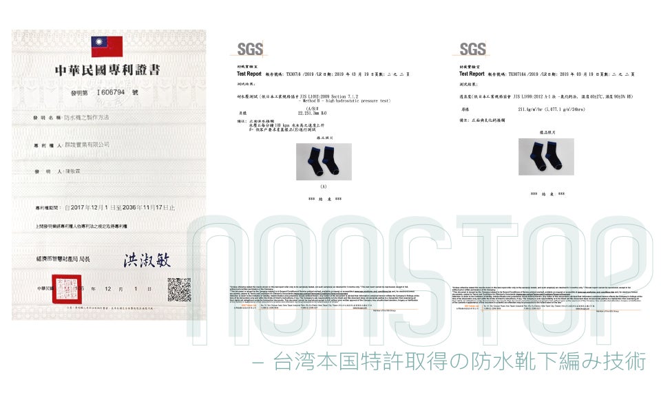 今回の「NONSTOP」はソックス製造23年の歴史を持つ台湾の工場で作られています。ソックス製造技術に関する特許を多数取得しており、台湾内外の多くの大手業者からも依頼を受けています。プロダクトのデザインはもちろん、その品質にも自信を持ってお送りします。