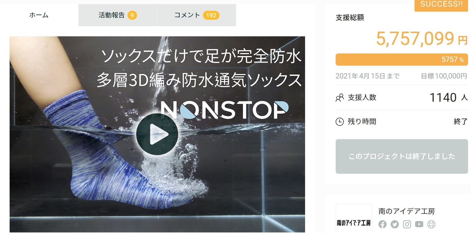 特許の「多層3D編み技術」を用い、100%防水の構造を実現し、滑り止め、通気と防臭効果も高い。靴を選ばずにソックスで完全防水することが実現する。