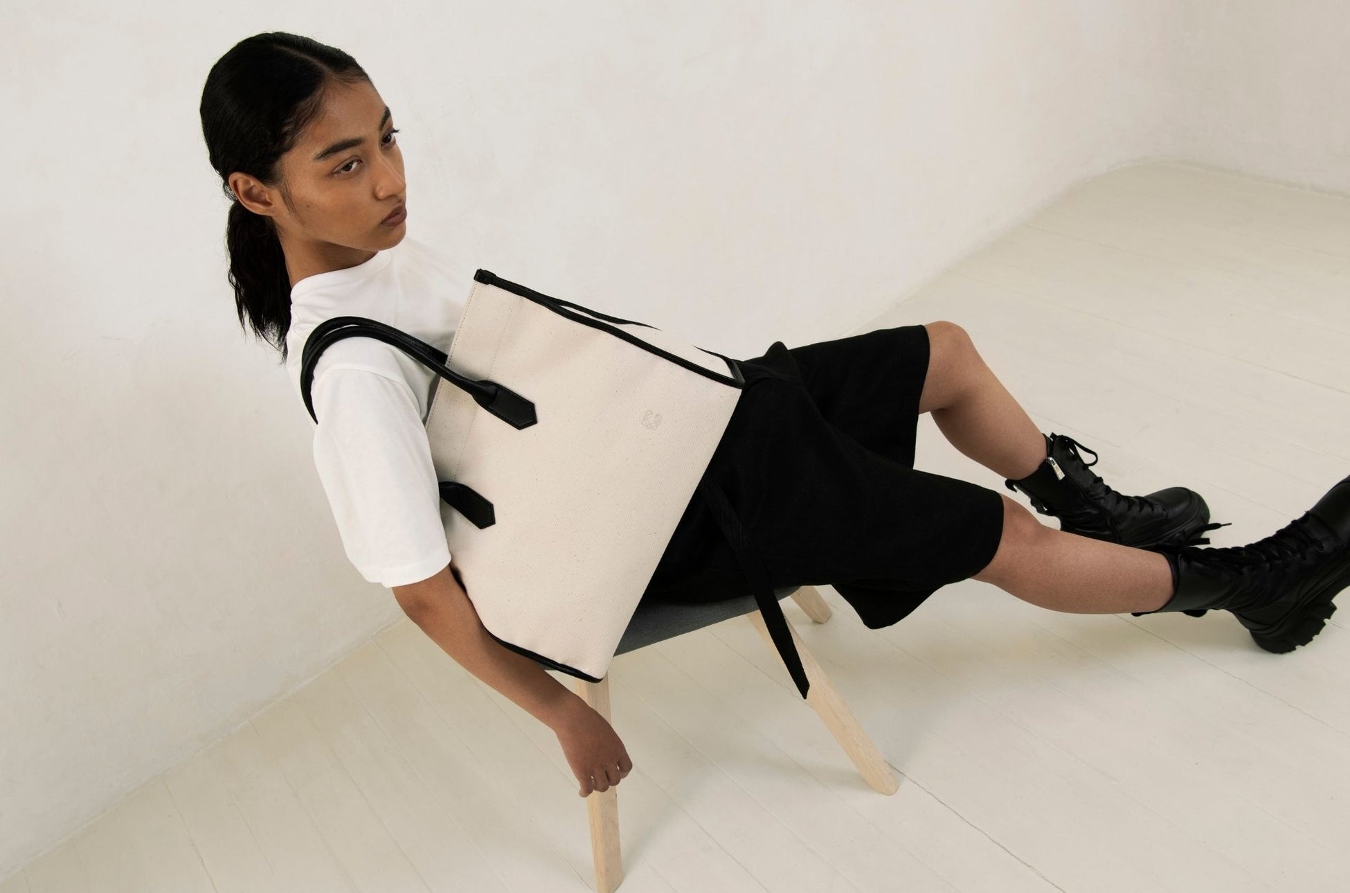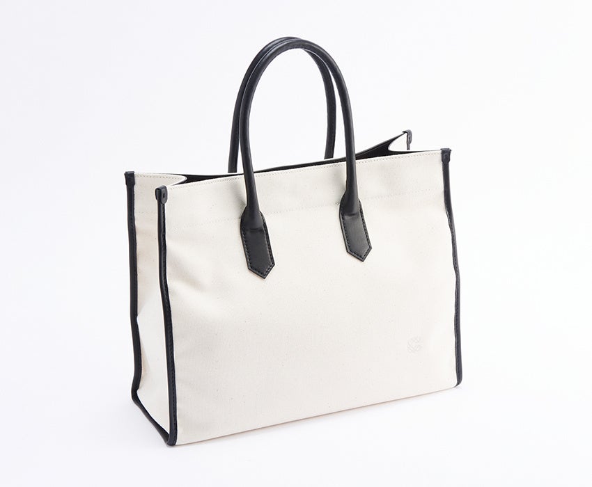 シンプル&シックなルックスがオン・オフ問わずに活躍するトートバッグ。異なる素材のコントラストが、表情豊かで洗練された印象を醸しています。ディテールにヴィーガンレザーをあしらいながらも、本体をオーガニックコットンキャンバス地で仕上げているため、その軽さが持つ人の移動を快適なものにします。ノートや書類など、A4ファイルがしっかり収納できる横長のフォルム。マチを広く確保し、PCや書類の収納はもちろん、1泊程度の旅行にも対応できる実用性が高いサイズ感に仕上げました。