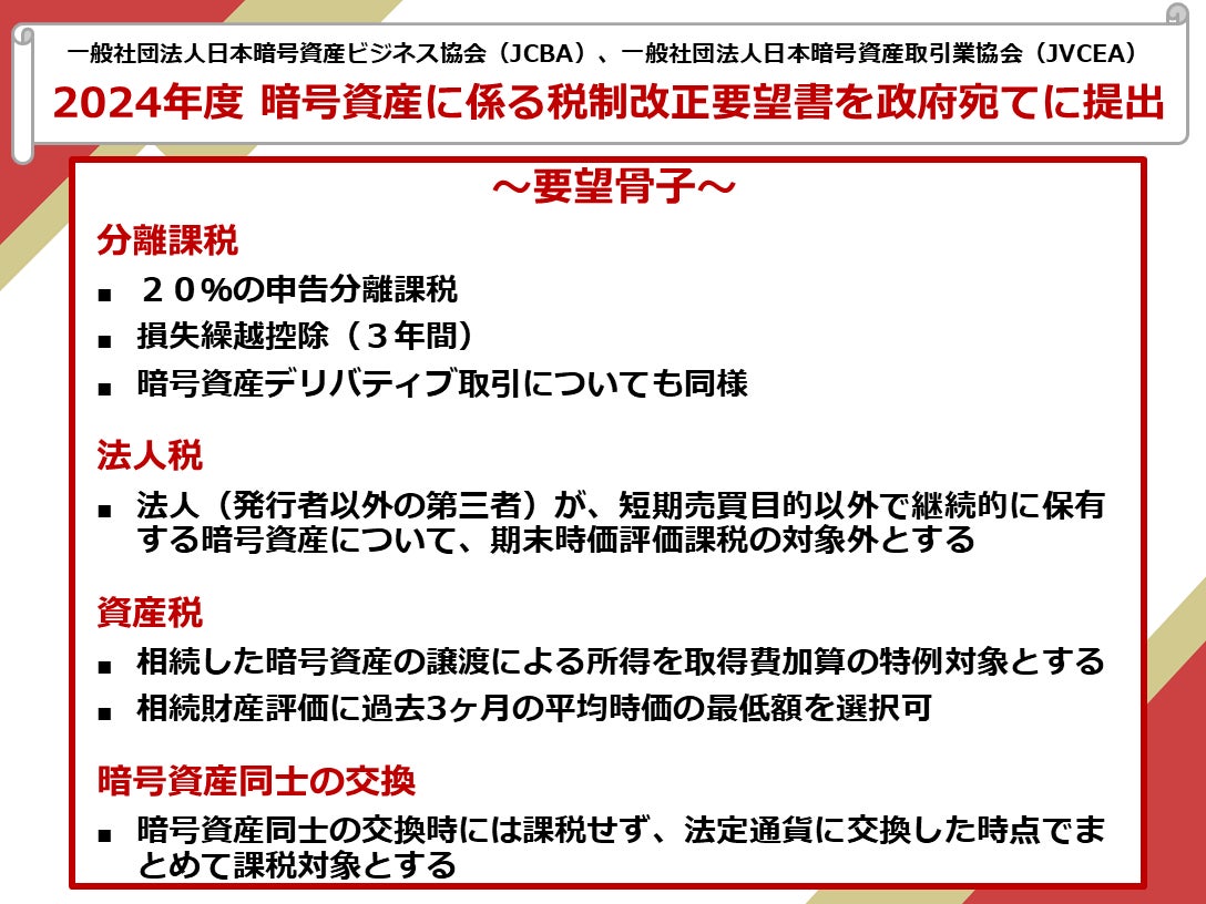 JCBA・JVCEA 暗号資産に係る2024年度税制改正要望書を政府宛てに提出