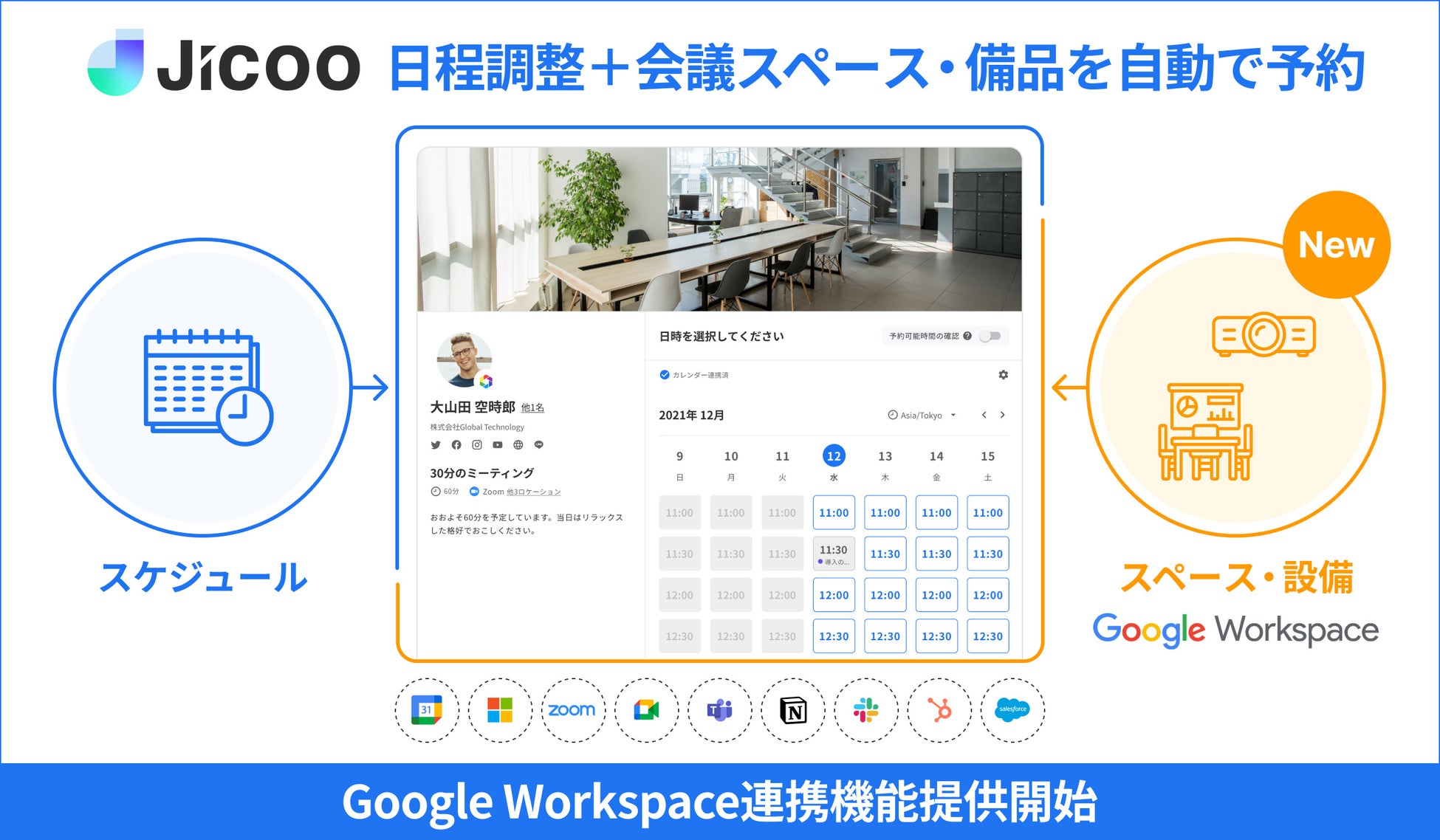 Jicoo(ジクー)、日程調整と同時に会議スペースや備品の予約を自動で行うGoogle Workspace連携機能の提供を開始