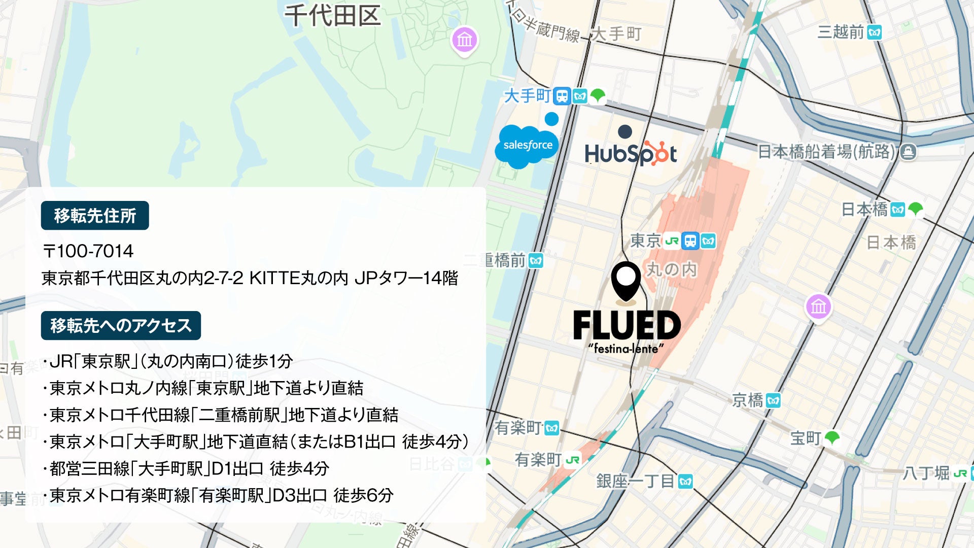 株式会社FLUEDは、BtoBマーケティング/営業DXに特化して幅広いご支援を行っております。この度、事業のさらなる成長を目指し、最適な周辺環境が整う丸の内エリアの新オフィスへ移転することを決定しました。