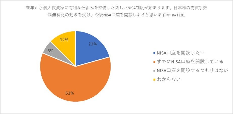 また、資産運用を行っている方に「来年から個人投資家に有利な仕組みを整備した新しいNISA制度が始まります。日本株の売買手数料無料化の動きを受け、今後NISA口座を開設しようと思いますか」と質問したところ、「すでにNISA口座を開設している」が61パーセントでトップの回答を集めました。2位には「NISA口座を開設したい」が21パーセントで続き、3位は「わからない」(12パーセント)。「NISA口座を開設するつもりはない」との回答はわずか6パーセントでした。現在、資産運用を行っている方は既に開設している方も含めてNISA口座の活用に積極的な姿勢であることがわかりました。