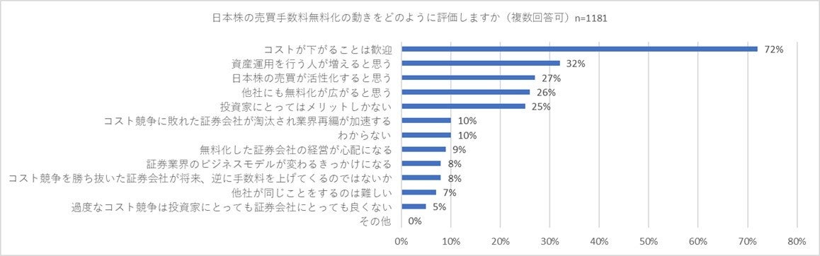 続いて、資産運用を「行っている」と回答した方に「日本株の売買手数料無料化の動きをどのように評価しますか」と尋ねました。その結果、「コストが下がることは歓迎」との回答が72パーセントで突出する結果となりました。以下、「資産運用を行う人が増えると思う」(32パーセント)、「日本株の売買が活性化すると思う」(27パーセント)、「他社にも無料化が広がると思う」(26パーセント)、「投資家にとってはメリットしかない」(25パーセント)と肯定的な回答が続きました。