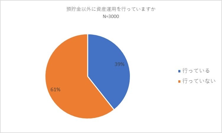 初めに回答者全員に対して「預貯金以外に資産運用を行っていますか」との質問を行いました。「行っている」と回答した方が39パーセント、「行っていない」と回答した方は61パーセントとの結果になりました。