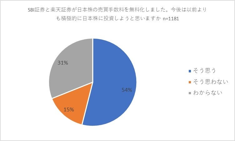 次に資産運用を「行っている」と回答した1,181人の方に「SBI証券と楽天証券が日本株の売買手数料を無料化しました。今後は以前よりも積極的に日本株に投資しようと思いますか」との質問を行ったところ、過半数の54パーセントが「そう思う」と回答。「そう思わない」(15パーセント)との回答を大きく上回りました。また、31パーセントの方が「わからない」と回答しました。