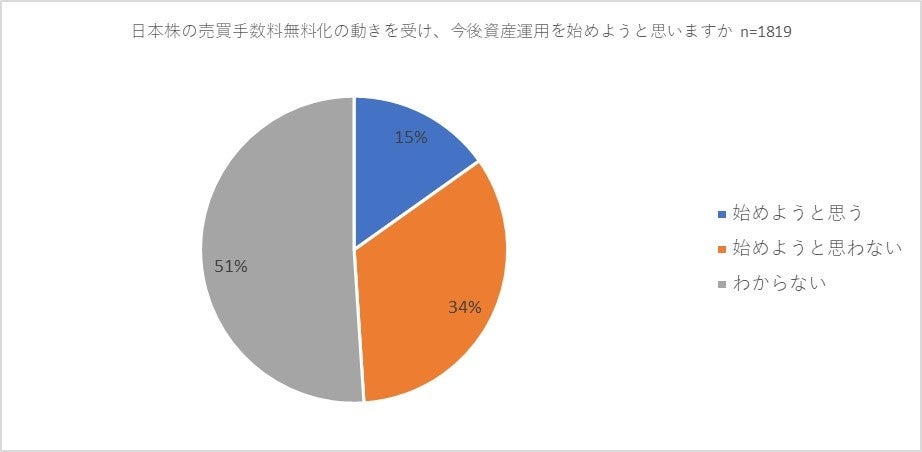 すでに投資を行っている方は、SBI証券と楽天証券の日本株の売買手数料無料化に関して「以前よりも積極的に日本株に投資しようと思いますか」との質問に過半数の54パーセントが「そう思う」と回答。一方、資産運用を行っていない方に対する「日本株の売買手数料無料化の動きを受けて今後資産運用を始めようと思いますか」との質問では「始めようと思う」との答えが、わずか15パーセントでした。
