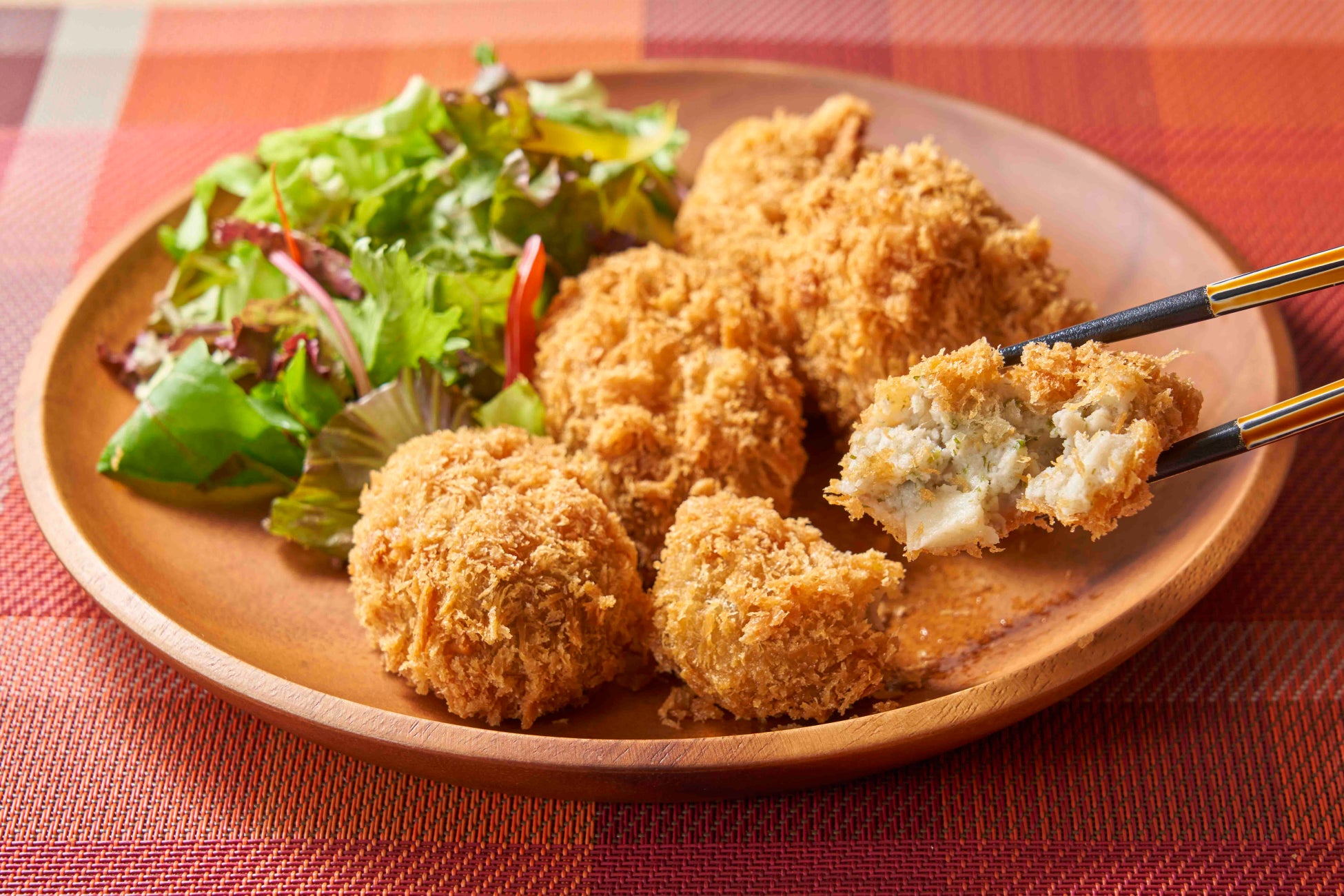 夏には「枝豆」や「コーン」、秋には「博多明太子」「里いも」など、その時期にぴったりの味を期間限定商品として展開し、根強いファンも多いコロッケシリーズです。定番の「ポテトコロッケ」「エビクリームコロッケ」もとんかつと合わせて購入されるお客様が多く、ロングセラーとなっています。