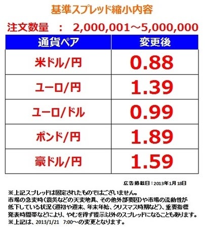 ■変更内容:下記通貨ペア基準スプレッド(1月21日(月)オープンから)