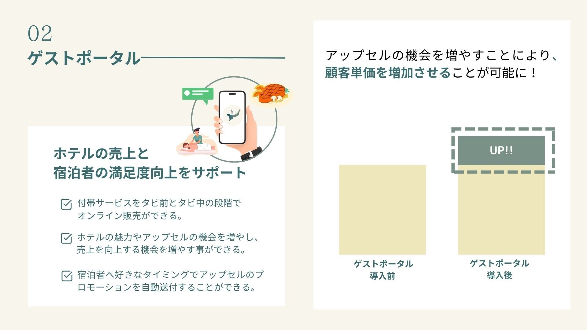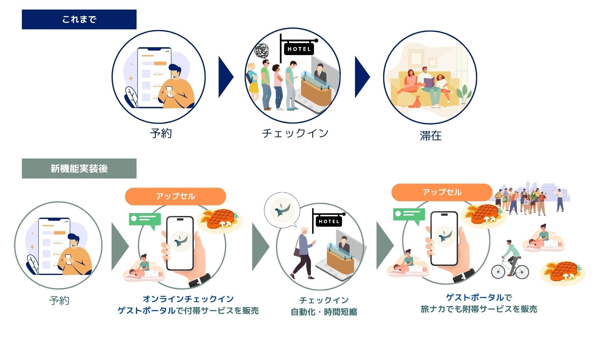 ゲストポータルは、宿泊者が自身のスマートフォンやパソコンから、予約やホテルの付帯サービスの管理を簡単に行うことができる機能です。宿泊前〜滞在中の段階で、自身の予約の確認や変更、客室のアップグレードや、レストランや観光ツアーなどの閲覧や予約、決済を容易に行うことができます。これにより、宿泊者はフロントへのお問い合わせをする手間を省くことができ、より計画的でスムーズな滞在を楽しむことができます。