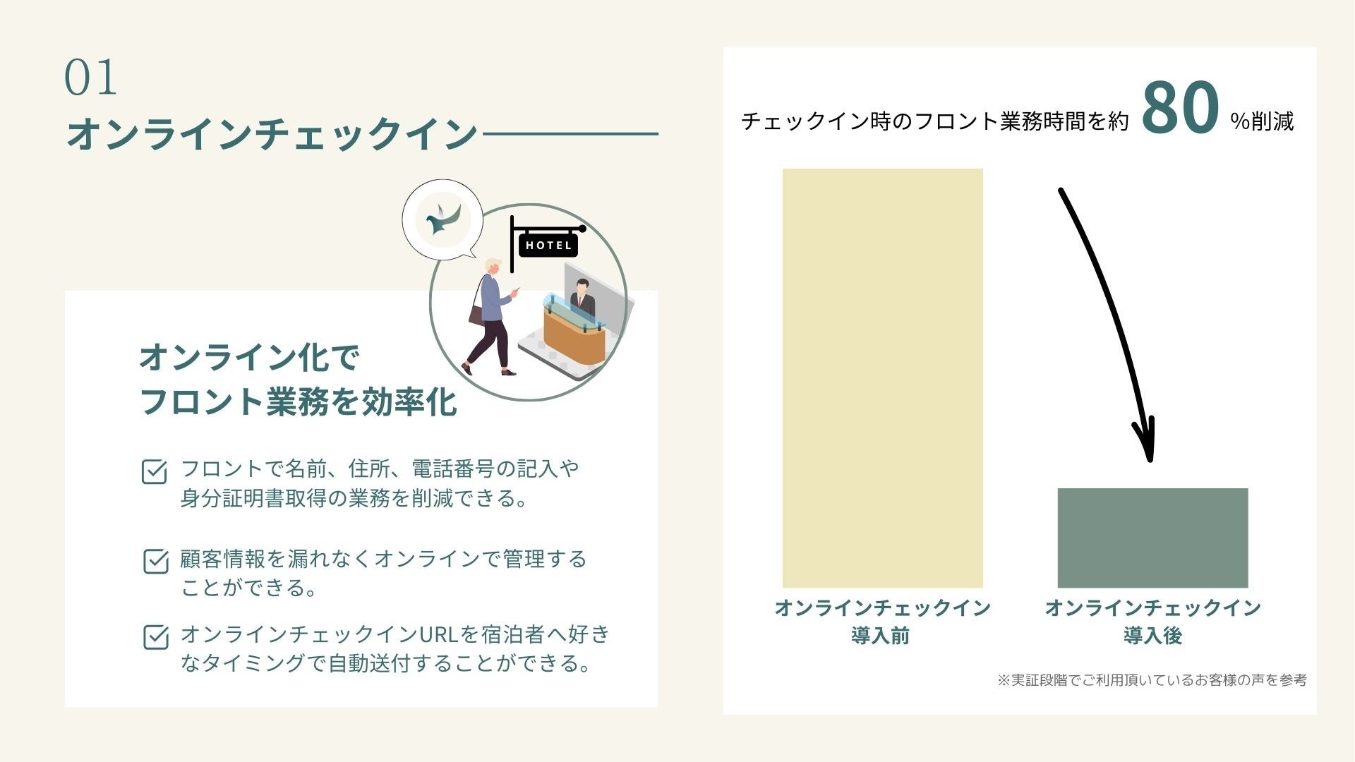 宿泊者が、予約完了後に自動で送られてくるオンラインチェックイン用のURLへアクセスすることにより、チェックイン時にフロントで必要な手続きを事前に済ませることができる機能です。オンラインチェックインの画面では、フロントで必要とされる名前や住所、電話番号、同伴者の名前、住所などの入力や承認のサイン、パスポートなどの身分証のアップロードができるようになっているため、宿泊者は宿泊施設に到着後、スムーズにチェックインをすることができるようになります。