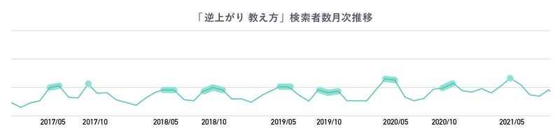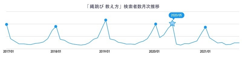 月別の検索数に注目する と、「逆上がり」は主に5月・10月前後、「縄跳び」は1月に検索されていました。これは学校で習うタイミングがある程度共通していることから見られる傾向だと推測されます。また、「縄跳び 教え方」の検索は2020年5月に例年と異なる増加が見られますが、これはコロナ禍の外出自粛や休園・休校の影響で、自宅で一緒に過ごす時間が増えた影響で検索が増えたものだと推測されます。