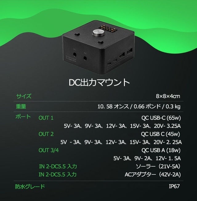 また、バッテリー本体に内蔵されている出力数が足りないときはACマウントやDCマウントを使う事で多くの機器に電力を供給できます。