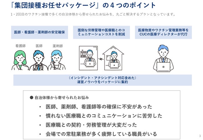 エムスリーキャリア株式会社は、エムスリーグループで国内外の医療機関に対し経営コンサルティング/運営支援を行う株式会社シーユーシー(本社:東京都中央区)とともに、「集団接種お任せパッケージ」による支援を展開してまいりました。