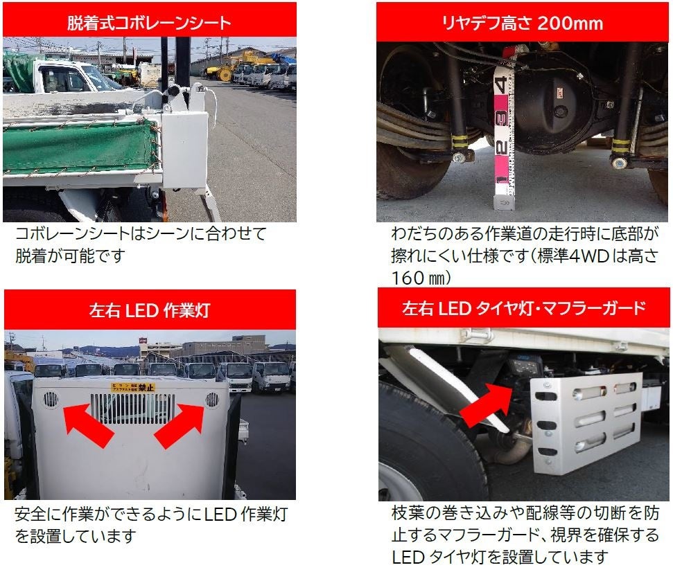 今回、本格レンタルを開始する「スタンションダンプ2.7t高床4WD」は、LSD(※1)を搭載し低速デフ(※2)仕様で険しい山道でも効率的に木材の搬出ができる車両設計にしました。また、荷台の高さを885mmと低くし低重心のため、狭い林道でも安全走行が可能です。最小回転半径5.2mと小回りがきき、明かりのない山や森の中でも安全に作業できるように、荷台やタイヤ周囲にLEDライトを装備しました。